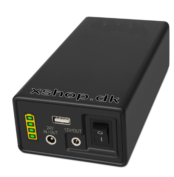 Output fra batteri: 12V & 24V (83W) via 5.5/2,1 mm DC jackstik (han OG hun), samt 1 x USB stik og dermed kan rejsekittet strømforsyne både en CPAP-maskine OG f.eks telefoner og/eller tablets.